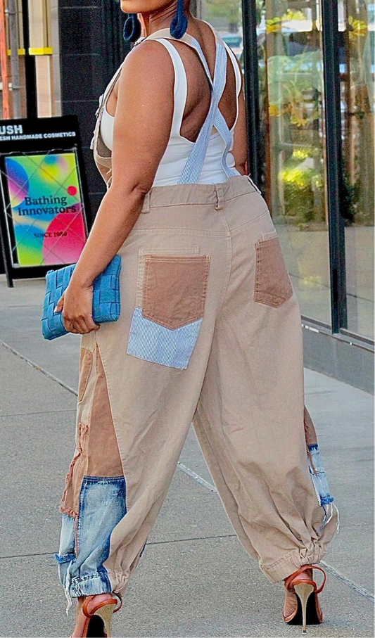Patchwork Baggy Overall Jumpsuit in Peach-Denim