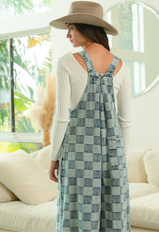 WAYNE WASHED VINTAGE CHECKER WIDE LEGS OVERALLS