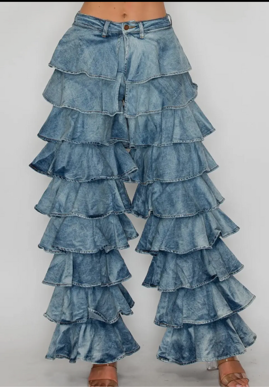 HIGH WAISTED RUFFLE DENIM PANTS