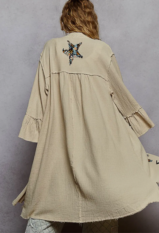 3/4 SLEEVE DOUBLE GAUZE PRINTED RUFFLE WOVEN LONG CARDIGAN