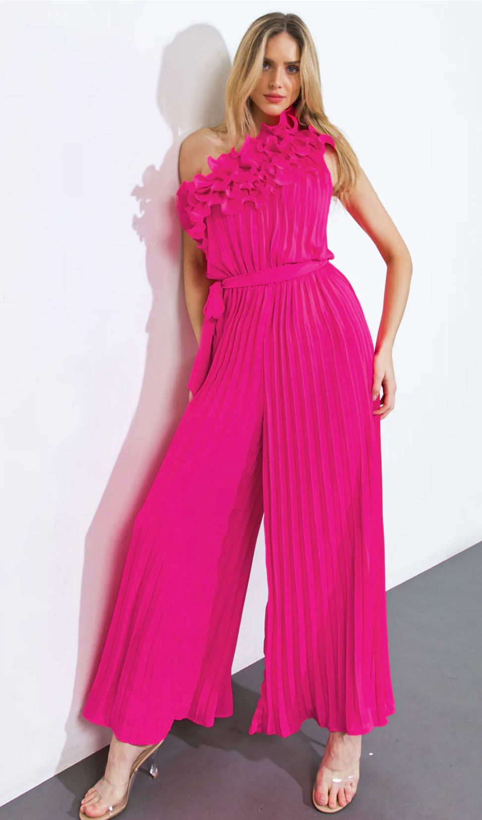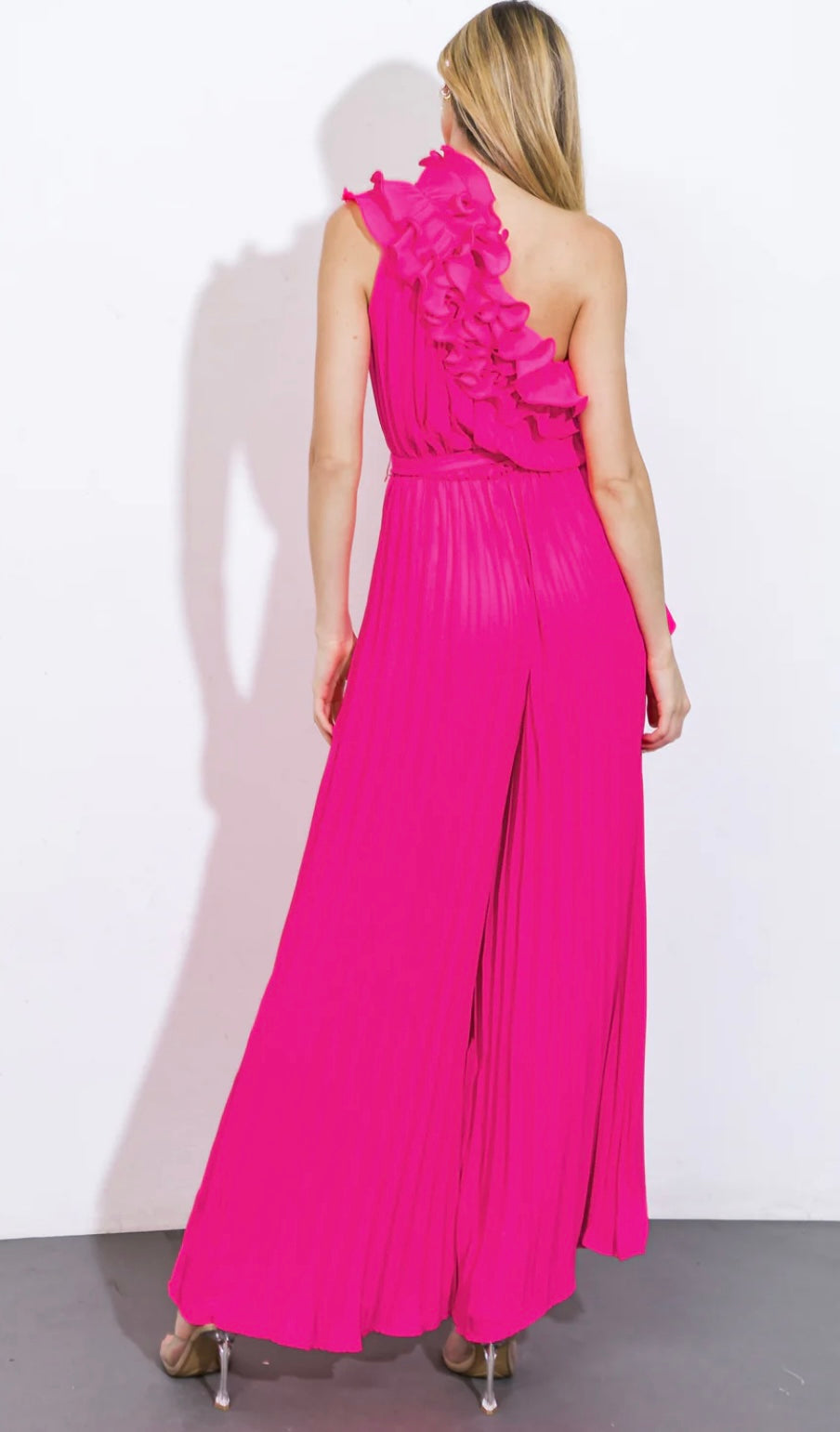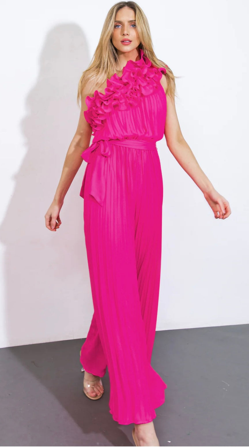 Elevate your look with our solid woven jumpsuit, featuring a sophisticated one shoulder neckline, stunning ruffle detail, and an elasticized waist with a luxurious self sash tie. Complete the elegant ensemble with the wide-leg design that exudes luxury and exclusivity.