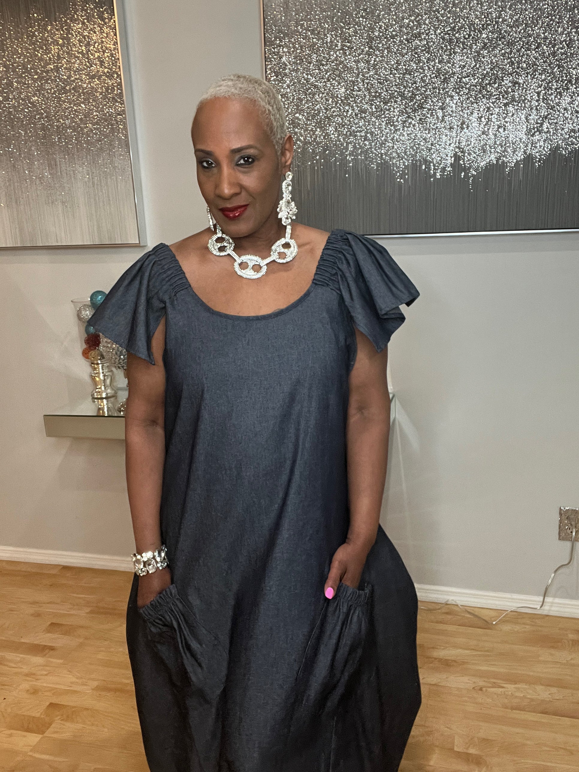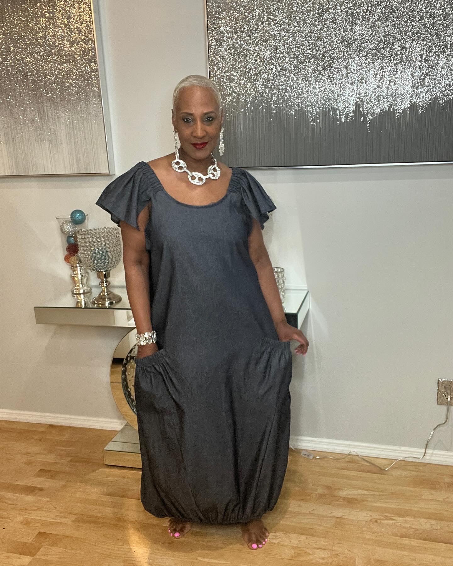 One size denim look solid bubble dress with short sleeves with pockets.High-quality material