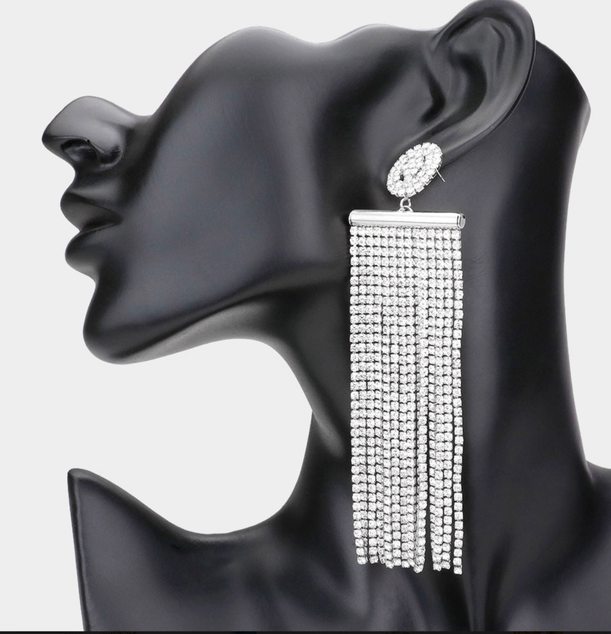 Silver Oversized Crystal Rhinestone Tassel Statement Earrings